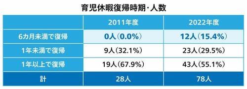 女性活躍推進の成果は目に見えて数字に表れている。同社の「子どもの生後6カ月未満で復帰する女性社員」の割合は、2011年度はゼロだったのが、22年度は15.4%まで増えている。