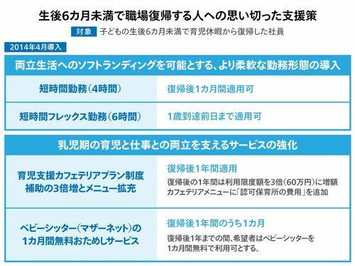 2014年4月には、子どもの生後6カ月未満で職場復帰する社員を支援するための“2つの柱”を打ち出した。1つは「仕事と育児の両立生活へのソフトランディングを可能とする、より柔軟な勤務形態の導入」。もう1つは「乳児期の育児と仕事との両立を支えるサービスの強化」だ。