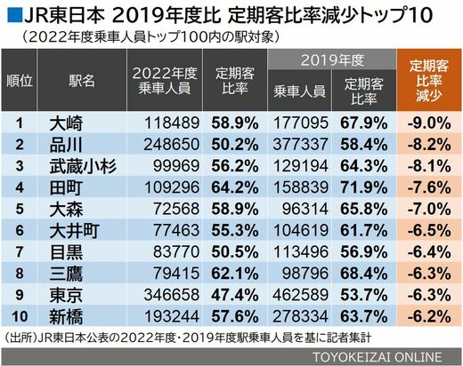 乗車人員に占める定期客の比率が下がった駅をランキングすると、大崎・品川・武蔵小杉・田町・大森・大井町と、上位6位には品川周辺、または京浜東北線沿線など同駅へのアクセスが便利な路線の駅が並ぶ。テレワークや定期券を利用しない通勤が広がったエリアと考えられそうだ。