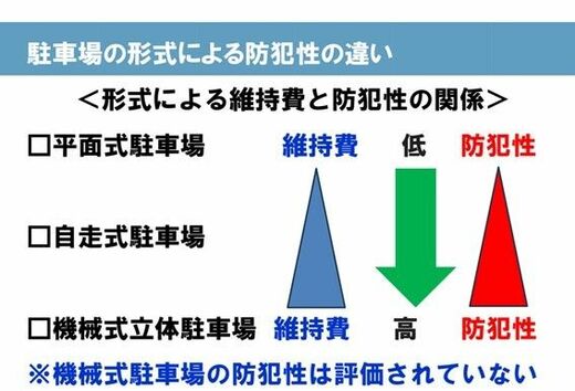 駐車場の形式で見ていくと、平面式駐車場での盗難リスクは高い一方で、維持費の面で課題の多い機械式立体駐車場での盗難リスクは低い。メンテナンスや使い勝手などで俎上に上がることの多い機械式立体駐車場ではあるが、防犯面では一定のメリットを有していることにも着目しておきたい。