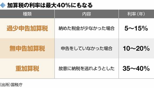 追徴課税の種類は3つ。納めた税金の額が過失で少ない場合は過少申告加算税(5〜15%)、正当な理由なく期限内に申告をしていない場合は無申告加算税(10〜20%)、故意に財産を隠していれば重加算税(35〜40%)が適用される。