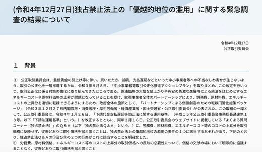 もっと簡単にいえば、物価上昇で大変な時代なのに、仕入先に納品価格アップの機会を与えてない企業をやり玉に挙げた。それは、公正取引委員会の「(令和4年12月27日)独占禁止法上の『優越的地位の濫用』に関する緊急調査の結果について」に詳しい。