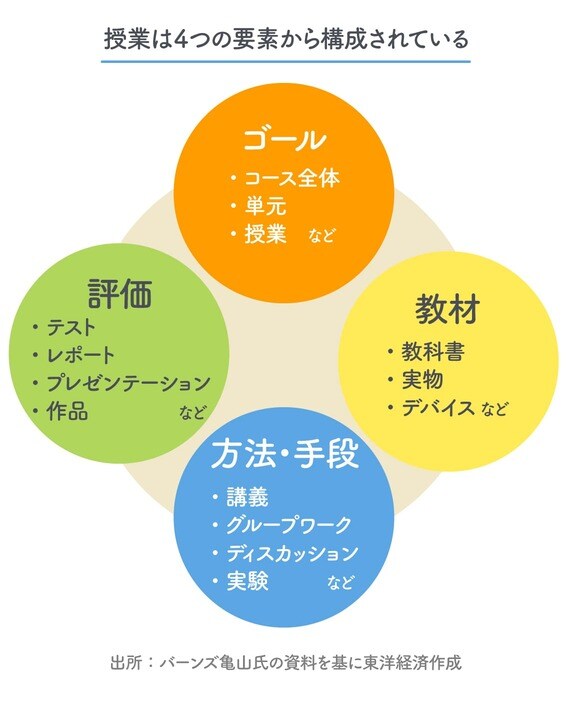UDLでは、授業は「ゴール、教材、方法・手段、評価」という4つの要素から構成されていると捉え、これらをどうデザインするかを考えていく。