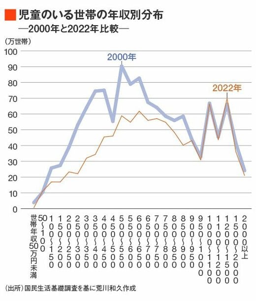 以下のグラフは、2000年と2022年の「児童のいる世帯」の年収別世帯数を比較したものです。児童のいる世帯の絶対数が減っていることはご存じの通りですが、グラフを見ると、世帯年収900万円以上の世帯に限ってはまったく減少していません。