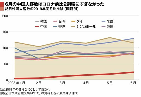 それがコロナ禍でぱったりと途絶えた。コロナ禍が沈静化した後も、中国政府は富裕層を中心とした個人旅行しか解禁せず、今年6月の中国人観光客数はコロナ前の19年比でわずか20%強。100%以上に回復している米国や、100%近くのアジア諸国と比べて明らかに見劣りしていた。