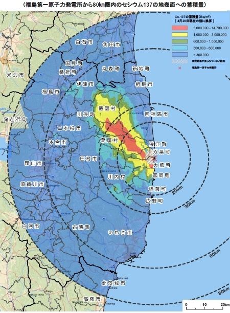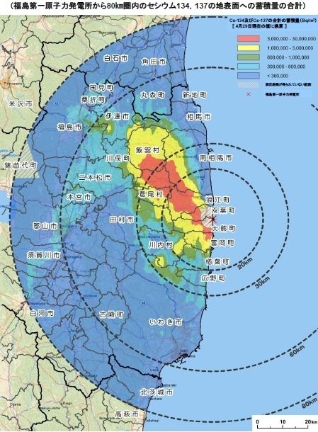 また、放射性セシウムによる土壌汚染地域は、30キロメートルを超えて飯舘村にかけて、1平方メートル当たり100万ベクレル以上の汚染地域が広がっている(図2、3)。この1平方メートル当たり100万ベクレル以上の汚染地域は、チェルノブイリ事故で立ち入り禁止とされた30キロメートル圏内の汚染に相当する(図4)。