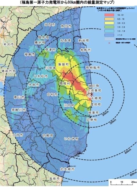 発表によると、福島第一原発から北西30キロメートルにかけて、毎時19マイクロシーベルトを超える高い放射線量(空間線量率)による汚染地域が広がっている(図1)。この地域では年間で約20ミリシーベルトを超える放射線を浴びることになる。