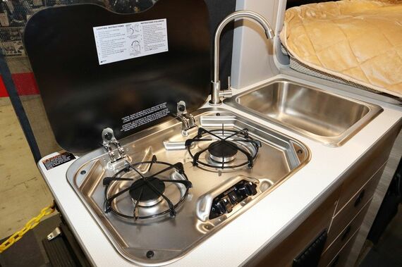 ギャレーには、ステンレス製シンクや2バーナーのコンロなどを採用。容量8kgの脱着式LPガスボンベや75Lの水タンク、容量85Lのコンプレッサー式冷蔵庫なども標準装備するため、室内でもさまざまな調理が可能だ。