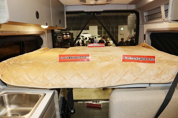 また、運転席と助手席は停車時に後方へ回転させ、ダイネットシートと連携させることで、リビングを拡大することも可能。オプションのフロントキャブ・エアマットレス(76cm×165cm)を使えば、運転席と助手席のシートを利用して追加ベッドにすることもできる。