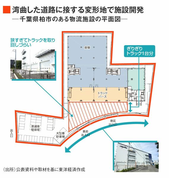 特筆すべきは敷地のいびつさだ。駐車場や倉庫部分の一部が突出しているうえに、接道部分が曲線状になっている。船井総研ロジの赤峰誠司取締役は、「接車部分(トラックバース)と車両出入口の間に余剰スペースがないため、車両を取り回しづらい。荷物の入荷に使われる10トン車のような大型車両は、そもそも施設に接車できないだろう。物流企業からすれば使いにくい施設だ」と分析する。