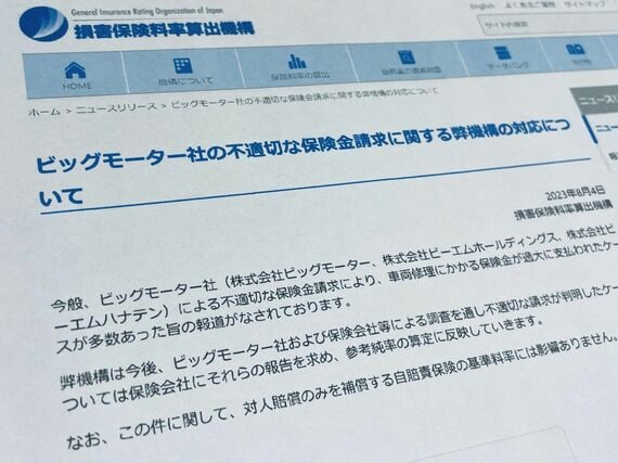 ビッグモーターの不正問題では、保険料計算の目安となる「参考純率」を決める損害保険料率算出機構が、「不適切な請求が判明したケースについては保険会社にそれらの報告を求め、参考純率の算定に反映」する方針を示している。不正の規模によっては保険料の“過払い金”が発生している可能性があるわけだ。