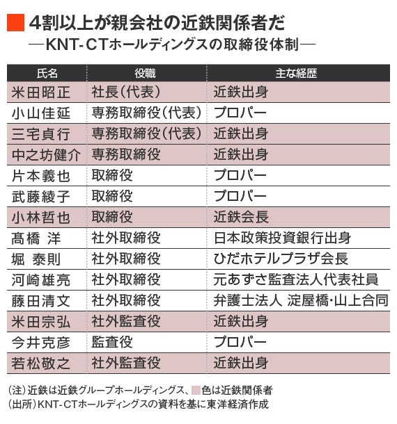 そもそもKNT-CTHDの取締役体制は、約4割が親会社である近鉄グループHD出身者だ。ガバナンス強化やコンプライアンスを徹底するには自浄作用が働きにくい構造と言える。コーポレートガバナンスを専門とする社外役員を招聘するなどの対応が求められるだろう。