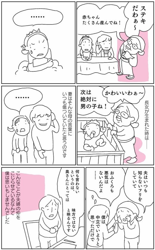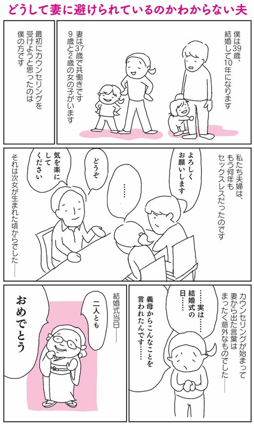 最近、妻とケンカが増えてきた。会話も減ってきて妻からは避けられているように感じる。理由もわからずどうしていいのかわからない。相談の主訴はセックスレスだったが、深掘りしていくと義実家と奥様の不仲問題が潜んでいることがわかった。妻は、結婚当初から義母の言葉に傷ついていたという……。