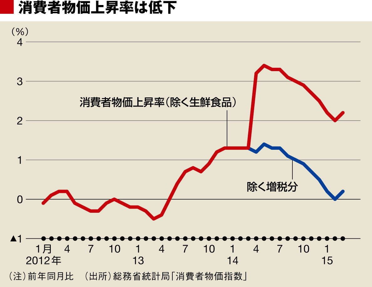 2014年夏以降の物価上昇率は低下し、10月末には量的・質的金融緩和の規模拡大が行われたが、物価上昇幅の縮小傾向は止まらず、15年春には増税分を除くとほぼゼロ%になっている。