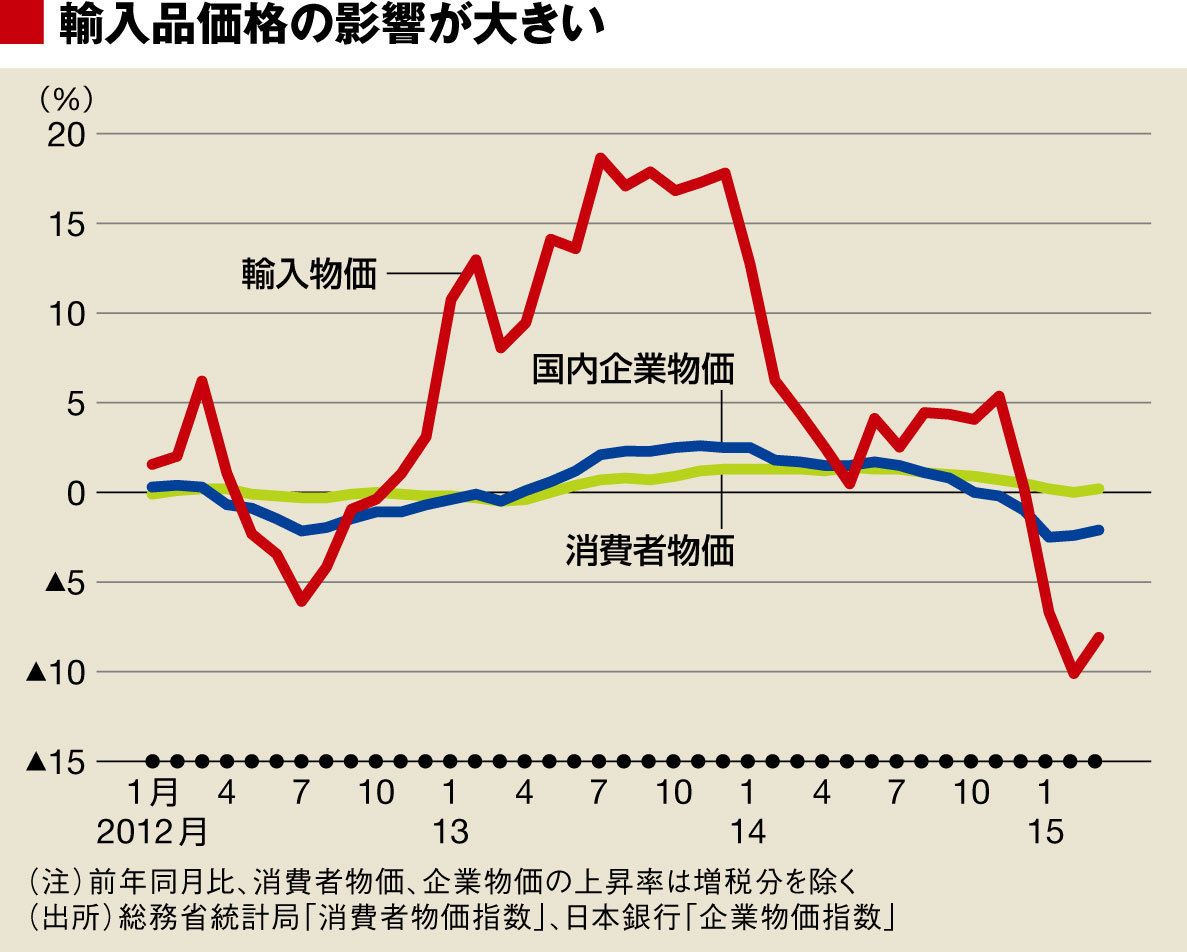 企業物価指数の輸入物価指数と、消費税率の影響を除いた国内企業物価指数及び消費者物価指数(生鮮食品を除く総合)の前年同月比上昇率のグラフを見れば、輸入物価の変動が国内企業物価を通じて消費者物価に大きな影響を与えていることは明らかだ。