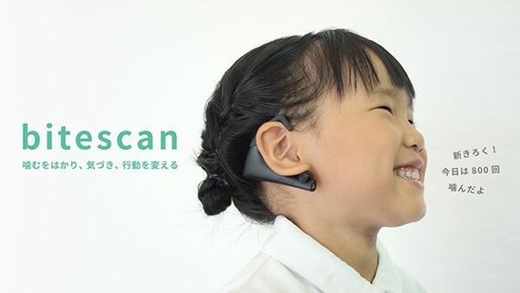 また、食事に関する行動変容を後押しする独創的なガジェット、咀嚼計「bitescan(バイトスキャン)」も話題だ。耳にかけるデバイスが耳裏の動きをセンシング。噛む回数やテンポ・姿勢など、さまざまな観点から自分の食べ方を把握・分析し、よい咀嚼習慣を身に付けるためのアシストをする。
