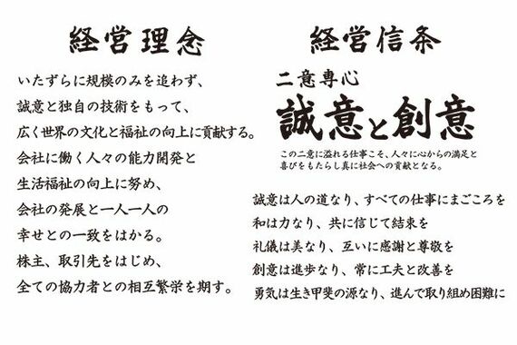 経営理念には、時代のニーズを先取りしたモノづくりを通して、社会に貢献し、信頼される企業を目指すという強い意志が込められている