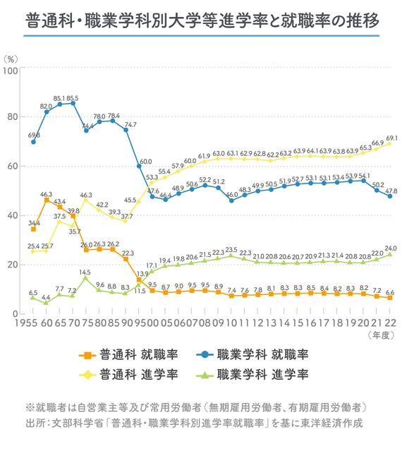 下の図を見ると、とくに1990年ごろから、高卒での就職率が大きく下がっていることがわかる。それに反比例して進学率は上昇。普通科高校では卒業者のほぼ7割が何らかの形で進学し、就職する人の割合は20年以上前から1割を切っている。思考停止でこの多数派に乗ることが、必ずしも「いちばんいい選択肢」であるとは限らないのだ。