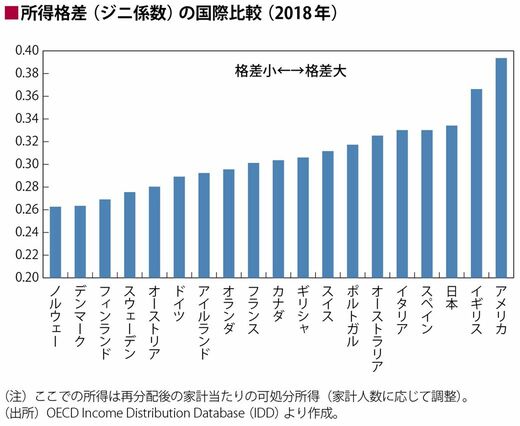 この点に関して以下の図を見ていただきたい。これはジニ係数という、経済格差の度合いを表す基本指標を国際比較したもので、数字が大きいほど経済格差が大きく、数字が小さいほど経済格差が小さい(=平等度が高い)ことを示している。
