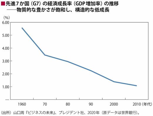 一方、以下の図に示されるように、先進諸国の経済成長率(GDP増加率)は1960年代から最近にかけて段階的に減少し、近年では構造的に低い水準となっている。これは、モノと情報がこれだけあふれた社会となり、人々の需要が大方成熟ないし飽和していることからすれば当然の事態であり、再び高度成長期のような時代が来ると考えるのはミスリーディングである。