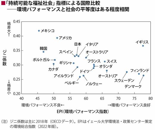 つまり「格差や平等」をめぐる問題と「環境」問題とは実は深く関連しているのである。そして、平等度が高く、環境パフォーマンスの良好な国々において根底にあるのは、(経済成長のみを追求するような志向とは異なる、)自然との関係も含んだ、相互の支え合いや社会的連帯、あるいは公共性の意識だろう。そうした「持続可能な福祉社会(sustainable welfare society)」と呼びうる社会が、おそらく人々の幸福/ウェルビーイングにもつながるのである。