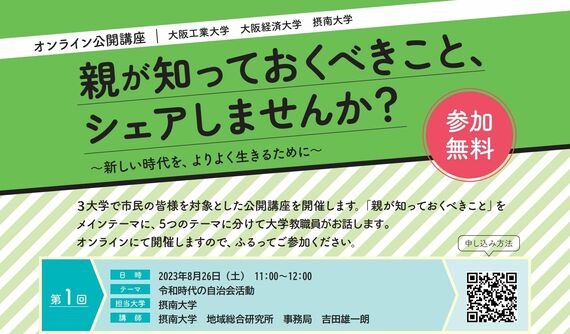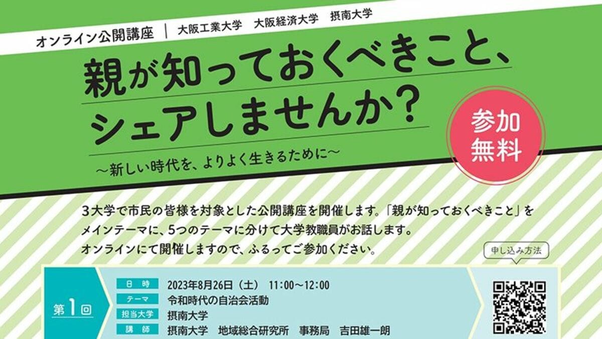摂南大学(荻田喜代一学長)は、2023年8月26日から5回にわたり、大阪工業大学、大阪経済大学と共同で、市民向けの無料オンライン公開講座を開催する。メインテーマは「親が知っておくべきこと、シェアしませんか?」。各大学の教職員が独自の視点から、子を持つ親が令和の時代に知っておくべきことについて講演する。第1回は8月26日に「令和時代の自治会活動」と題して行われる。受講は申し込みが必要。