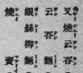 昭和16年に発行された米田祐太郎『生活習慣南支那篇』に、広東市政府の劉書記長がまとめた広東料理一覧が載っています。そこには広東料理の漢字表記とともに、広東語発音がカタカナで併記されています。