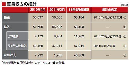 輸出の減少と輸入の増加というこの傾向は、今後、さらに拡大するだろう。事実、3月11日以降だけを見れば、輸出は前年同月比で9・7%減となっている。今後、火力発電増強の影響で、LNG(液化天然ガス)や原油の輸入が増加するだろう。大震災の影響は、3月の貿易収支にはまだ完全には表れていない。