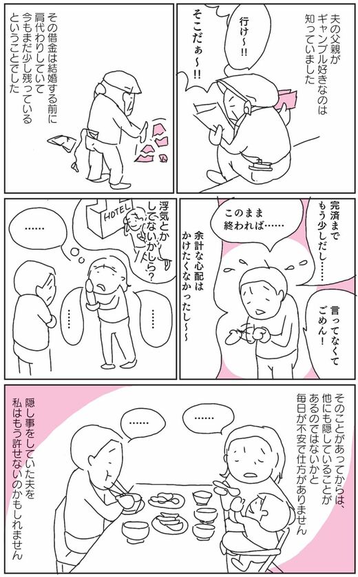 阿部由佳さん(以下、敬称略):夫に結婚前からずっと支払いをしているカードローンの借金があったんです。お義父さんのギャンブルの借金を肩代わりしたものなので、彼の問題じゃないのはわかっていますが、金額は、私たちにとっては少なくはない額です。