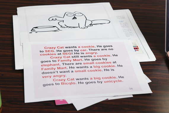 英語の文法は、中学1年生や中学2年生を対象にした「TPRS」と呼ばれる手法でオールイングリッシュで楽しみながら学ぶ。1枚のイラストから「この猫の名前は何にしよう?」「彼は何を欲しがっていることにする?」「どこに行こうとしていると思う?」といった答えのない設問に英語で自由に答えながらクラスでオリジナルの物語を英語で作っていく。出来上がったストーリーを通じて、文法やフレーズを学ぶのだ。