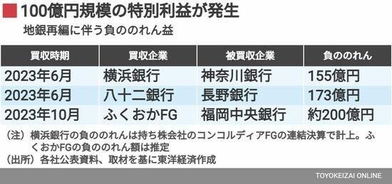 10月には福岡銀行を中核とするふくおかFGも、福岡中央銀行を完全子会社化する。株式交換比率から試算すると、負ののれんが200億円程度発生する見込みだ。