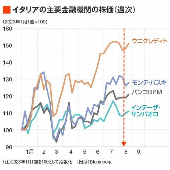 イタリアのジョルジャ・メローニ首相を首班とする右派連立政権が、いよいよ「本領」を発揮してきた。同政権は8月7日、金融機関の純金利収入(金利収入-金利支出)に対して、40%の超過利潤税を課すと閣議決定した。欧州中銀(ECB)による金融引き締めで金利が上昇し、銀行の利益が急増したことが課税の主な理由だ。