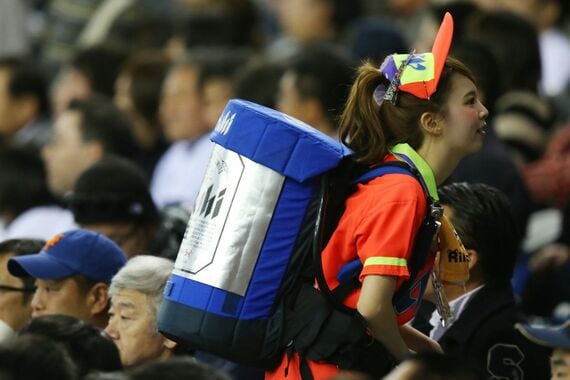 そんな野球選手と同じように、野球場で奮闘する娘たちがいる。ビールの売り子さんだ。正しくは、「立売スタッフ」という職業名である。プロ野球シーズンだけの季節限定のアルバイトだ。