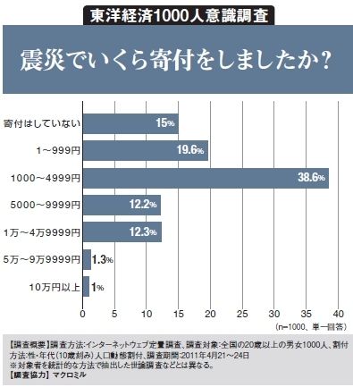 東日本大震災での甚大な被害を目の当たりにし、「自分には何ができるか」と考えた人も多かっただろう。もっとも身近な支援の方法として「募金」がある。日本赤十字社には、これまで約1,820億円にのぼる義援金が寄せられている(2011年5月11日現在)。今回は、各個人がどれくらいの金額を寄付したのかアンケートを行った。