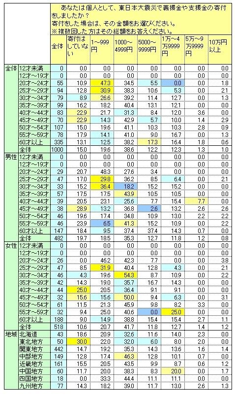 東日本大震災での個人の寄付金額は、男性・女性とも1000円~4999円が最も多かった。20代や30代前半では、男女ともに1000円以下という回答も目立ち、また40代では「寄付をしていない」という人も少なくない。一方で、高額な寄付をしている層も見られる。たとえば、20代前半の女性のうち、3.8%は10万円以上の寄付をしている。また、50代後半の女性では25%が1万円~4万9999円、40代前半の男性では7.7%が5万円~9万9999円の寄付をしたと答えている。