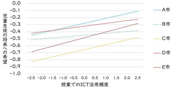 21年度の政令指定都市調査の結果、授業でのICT活用は、児童生徒の将来への希望※2の形成を促す効果があることが示されました。とくに学習エンゲージメント(没頭して学習に取り組む心理状態)が低い児童生徒ではその効果が比較的大きくなっています。
