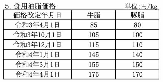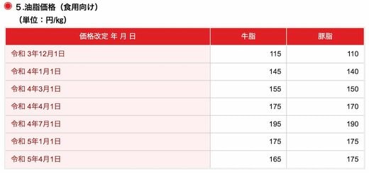 JA全農ミートフーズ株式会社が公表しているデータによると、豚脂の価格は、令和3年4月は80円/kg程度だったが、同年の12月には110円/kgとなり、令和4年7月には190円/kgを記録した。その後は175円/kg程度で推移しており、一時よりは落ち着きつつある一方で、2年前と比較すると2倍以上の価格となっている。また、背脂の等級によっても金額が違い、背脂の質にこだわっている店では、さらに高くなる傾向にある。
