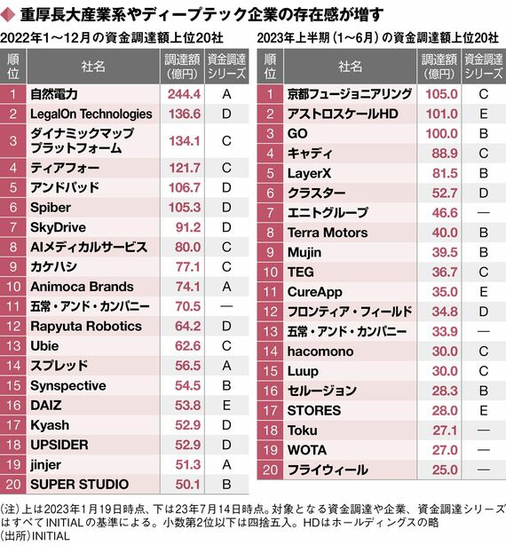 スタートアップ情報プラットフォーム・INITIALの調査によれば、2023年上半期の資金調達額でトップとなったのは京都フュージョニアリング。同社は、究極のクリーンエネルギーと目される核融合発電のプラント部品などを開発する。5月に産業革新投資機構(JIC)系のグロースファンドなどから105億円を調達した。