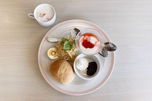 見た目のかわいらしさが乙女心をくすぐる「小倉ホイップトーストモーニング」は、税込438円。パンとサラダ、いちごヨーグルトと小倉ホイップに、ドリンクバーがセットになっています。