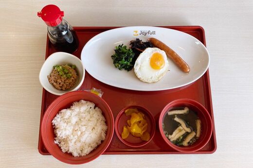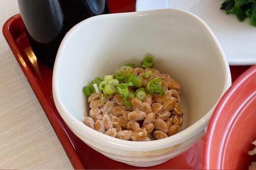 納豆がパックではなく小鉢に移し替えられて、小ネギが散らされています。このひと手間を438円でかけられるしくみが、私にはわからない。白ごはんの量もしっかりあるし、ソーセージは大きいわ、きちんとソテーしてあって軽く焦げ色もついていて粗挽きでプリプリだわ、なんとも隙がない和朝食です。