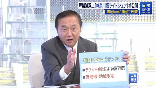 黒岩祐治(神奈川県知事):今、タクシー業界を敵に回して「タクシーは黙っていろ」、「こうやるんだ」というやり方では絶対に物事は前に進まないと思う。私は神奈川版のライドシェア案。ただちょっと雑ではあるが、まとめて言う。1番のポイントは、タクシー会社を巻き込む、一緒にやっていくということ。タクシー会社にまずは運行管理をお願いする。だから、一般のドライバーの車も、運行管理はタクシー会社にやってもらおうということ。
