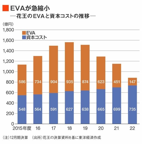 花王が20年以上も財務戦略の軸にしてきたのが、資本コストを上回る利益をどれほど生み出したかを測るEVA(経済的付加価値)という指標だ。全体の投下資本に対し、いかに収益性を向上できるかという考え方になる。日本で初めてEVA経営を導入して以来、看板として成長を続けてきた。