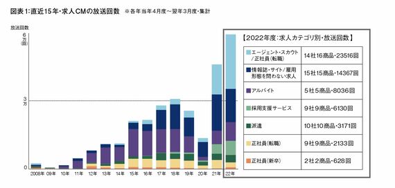 2022年度(同年4月度〜2023年3月度)に、放送されたCM(東京キー5局集計)のうち求人情報関連CMは、46企業から計5万7961回に。15年前の2008年度には2335回にすぎなかったから、ざっと25倍に膨れ上がった。