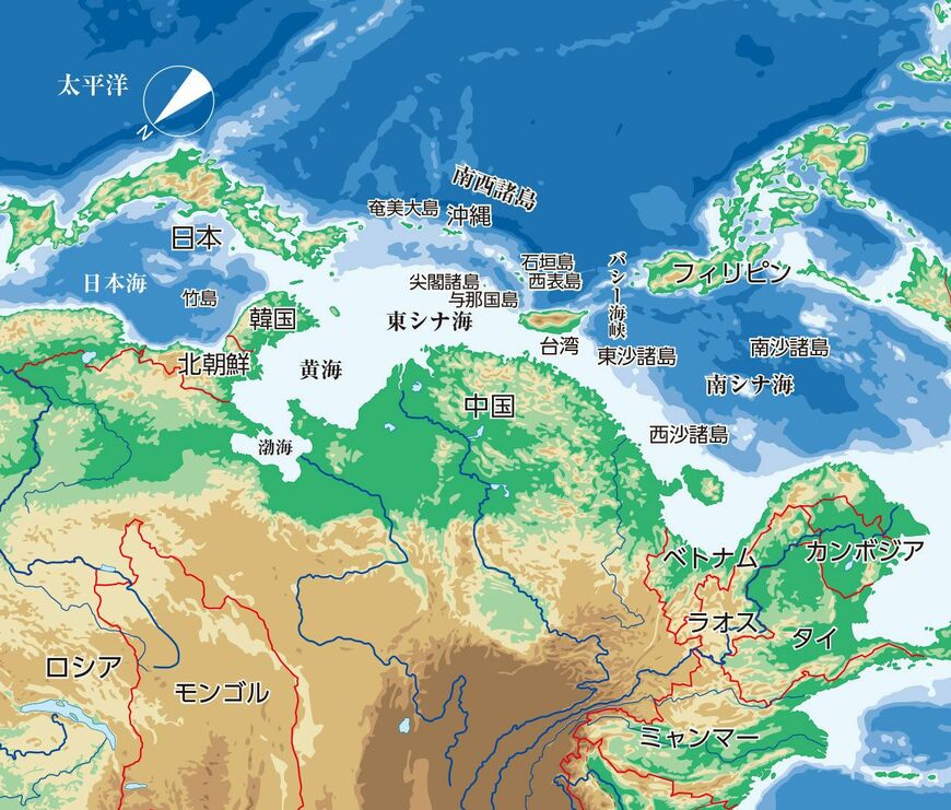 中国にすると、大陸から見える海は狭く、すぐ近くに日本列島がある。さらに南に下ると九州から奄美諸島、沖縄、八重山と南西諸島が連なっており、台湾につながっている。台湾からはバシー海峡を挟んでフィリピンへと続き、その端はベトナムに連結している。
