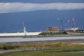 万博開催に向けた会場整備が本格化しようとしている夢洲を、約1キロ南の対岸にある「南港野鳥園」(大阪市の施設、正式名称は野鳥園臨港緑地)の展望塔からカメラの望遠レンズを通して見た。赤と白の工事用クレーンが立ち、万博協会のホームページで目をひく大屋根(リング)の一部だろうか、作りかけの木製の建物が見える。
