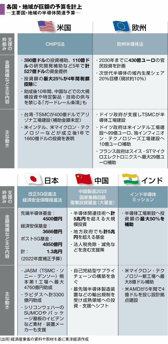 さらに、これまで自国内の生産基盤がほとんどなかったインドも「インド半導体ミッション」を掲げて約1兆円の予算を計上。誘致合戦に参戦している。