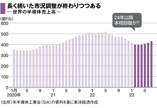 市況もようやく上向きつつある。半導体市場は「シリコンサイクル」と呼ばれる好不況の波を繰り返しながら成長してきた。直近の好況の波は2020年のコロナ禍によるPC・スマホなどデジタル機器の特需によって起こり、世界半導体市場統計によれば2021年は前年比26%増と急激な伸びを記録した。だが2022年の後半以降は特需の反動で急失速。以降、冬の時期が続いてきたが、今年の初めにはすでに底を打った。