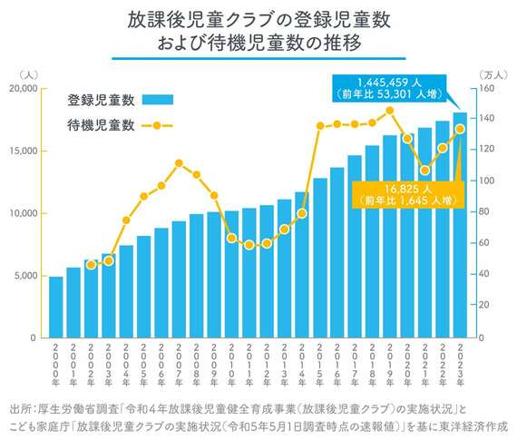 学童保育の登録児童数はここ20年ほど右肩上がりで増え続けており、待機児童数も高止まりしている。学童保育に子どもを預けられないことでいわゆる「小1の壁」に直面し、離職せざるをえない女性などもおり、社会問題化している。