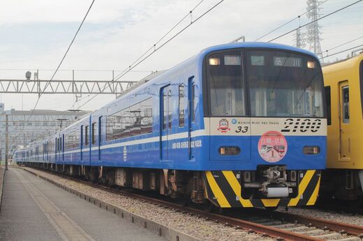 2100形は8両編成10本が在籍する。そのなかで“異色”なのが、「KEIKYU BLUE SKY TRAIN(ブルースカイトレイン)」。「赤い電車」のイメージが強い京急車両のなかで、青色塗装がひときわ目立っている。2016年2月には台湾鉄路管理局との友好鉄道協定提携1周年を記念したラッピングが話題になった。