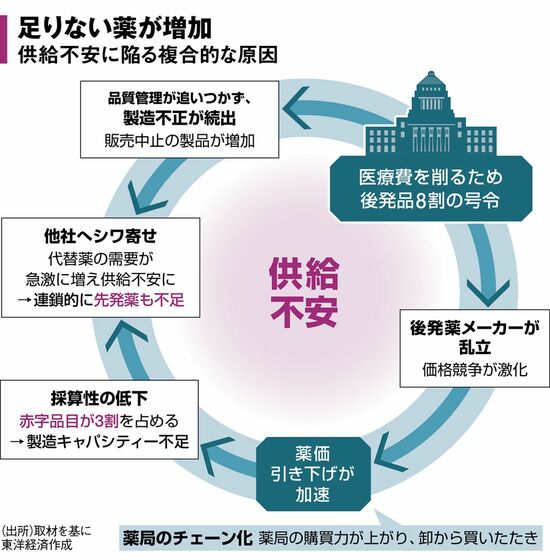 中堅後発薬メーカーの営業担当はそう表現する。こうした連鎖は同じ成分の先発薬にも及ぶため、先のような漢方薬まで含めた薬全体の供給不安に及んでいるのだ。
